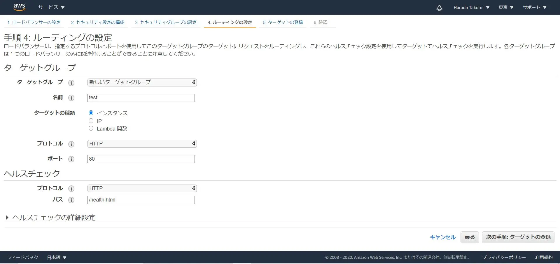 名前は同じくtest、ヘルスチェックの部分だけhealth.htmlを選択します。