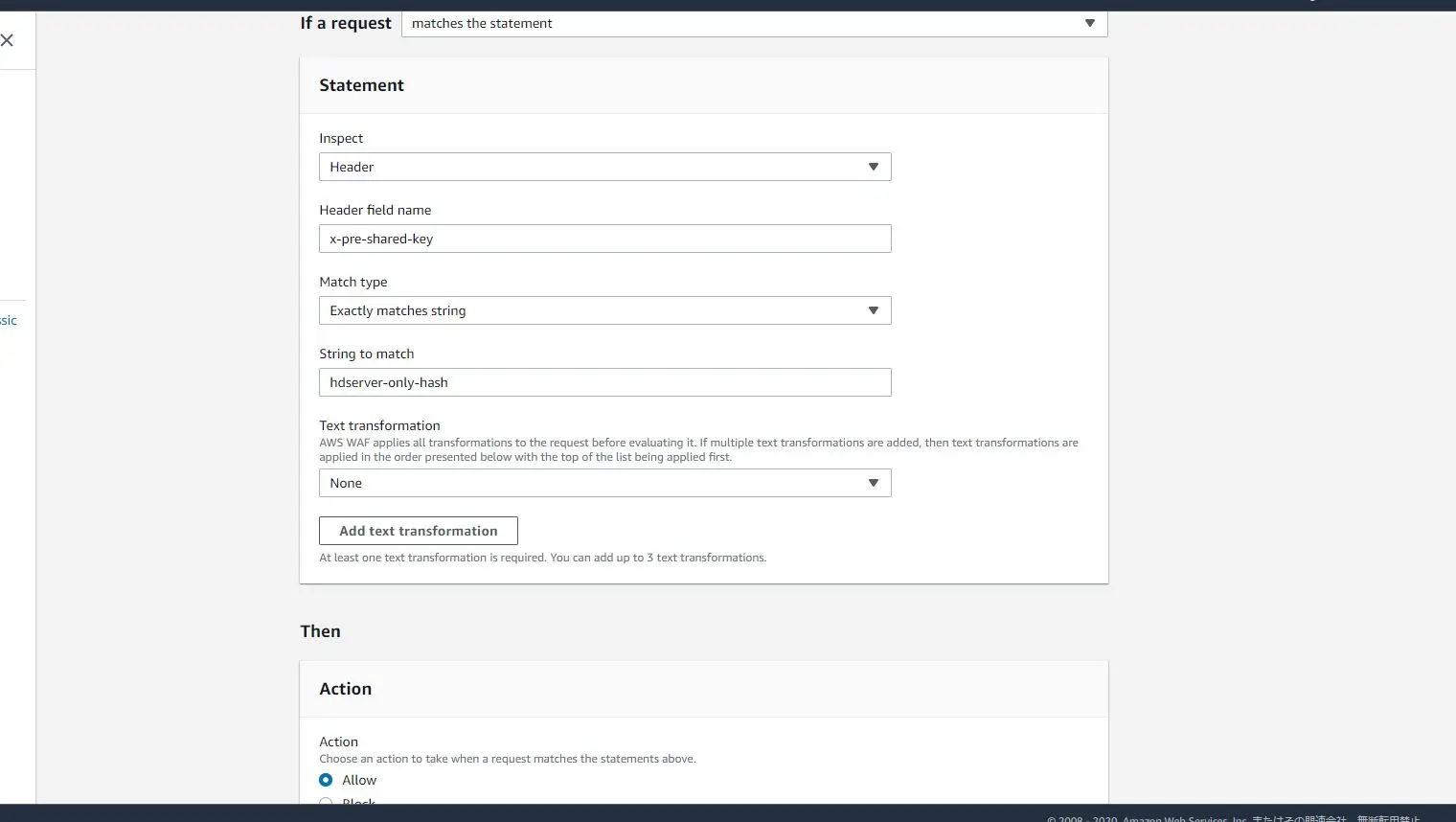 マッチした場合のルールはAllowにします。Default の挙動はBlockにしましょう。