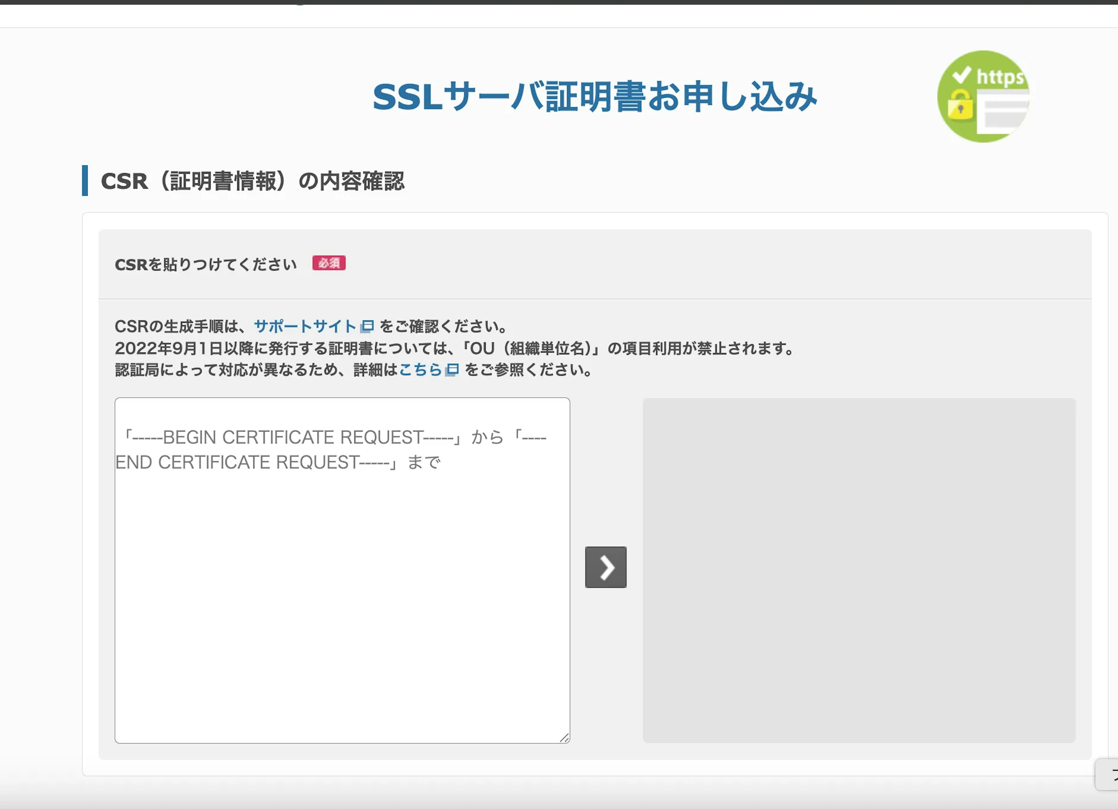 約款・規約に同意して次へ進むと、CSR(証明書情報)の内容確認のページに移ります