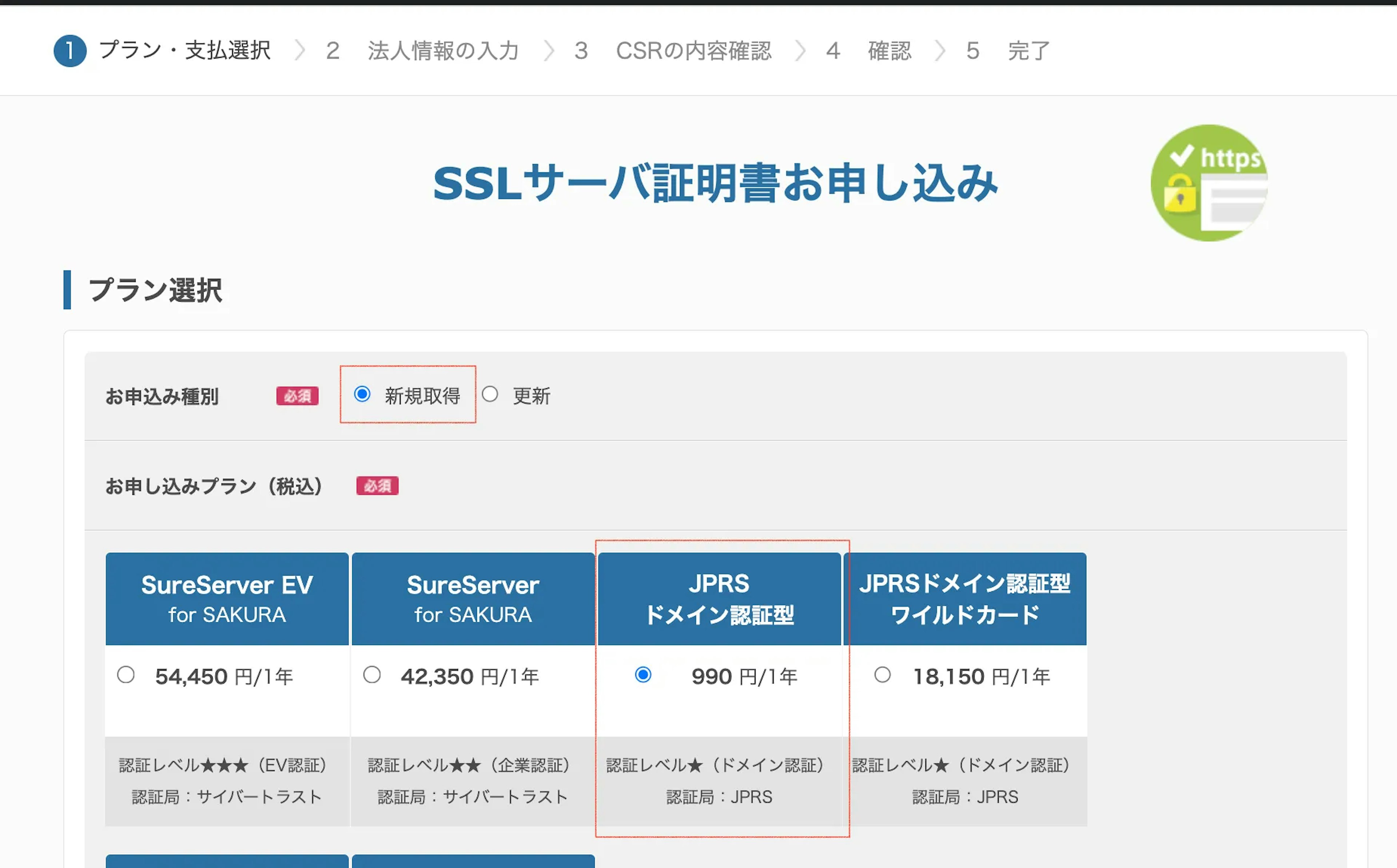 申し込み種別は「新規取得」、プランは「JPRSドメイン認証型」を選択