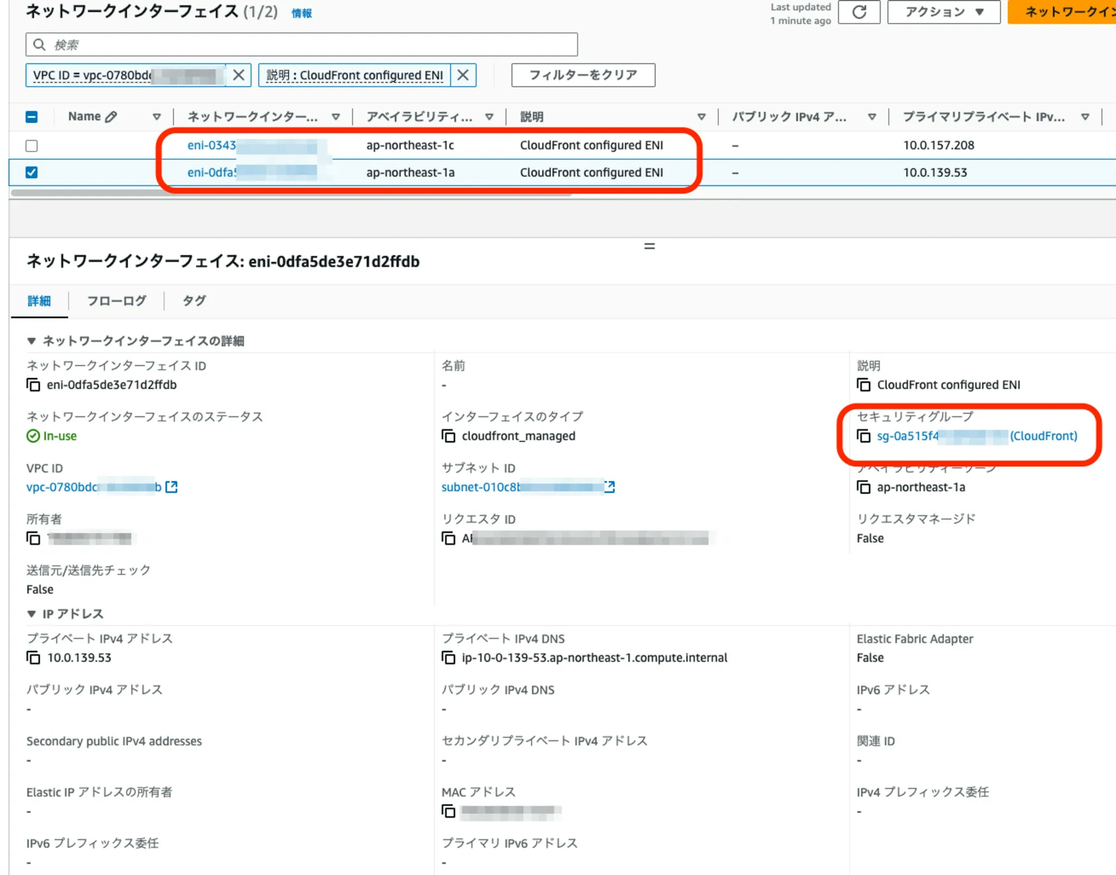 - VPCオリジン作成が完了すると、CloudFront用のENIとSecurityGroupが自動的に作成されます。