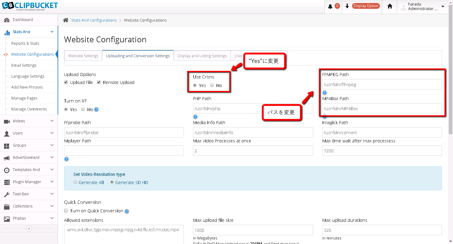 FFMPEGとMP4Boxのパスが違う箇所になっているので、サーバ内の正しいパスを記載しておきます。