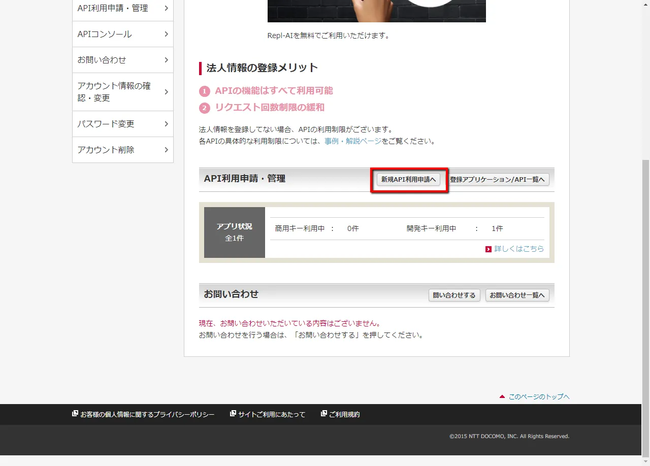 2. Docomoの雑談対話APIの申請を行う