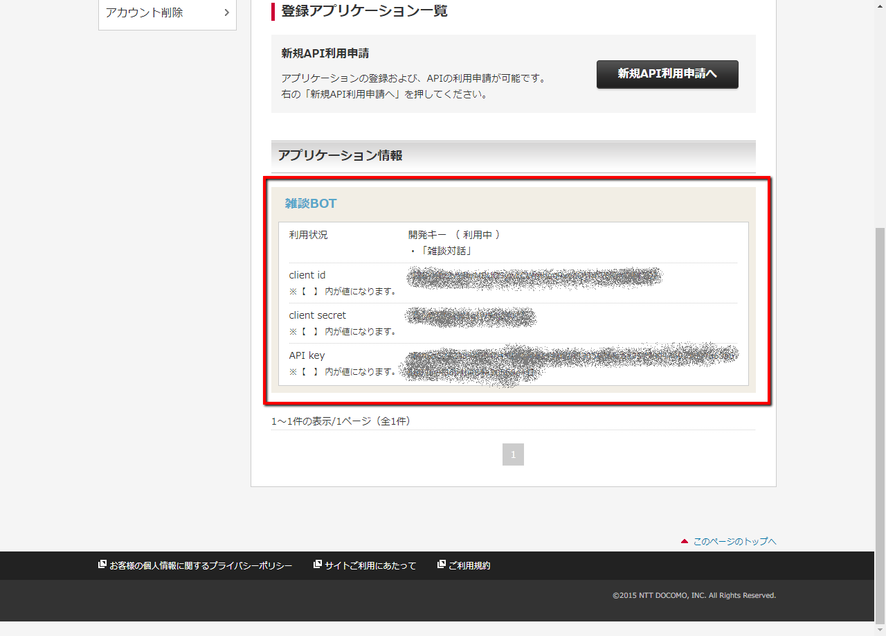 Docomo の API ですが、docomo Developer support に登録後、 マイページの「新規API利用申請へ」から登録処理を行えば API key などが発行され、 雑談対話API を利用できるようになります。