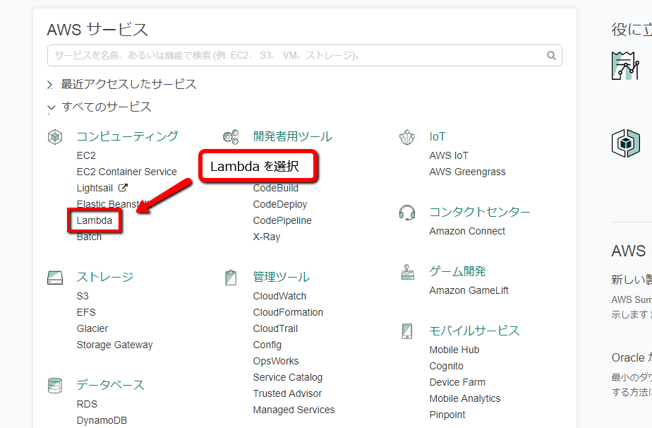 AWS のコンパネで Lambda を選択して…