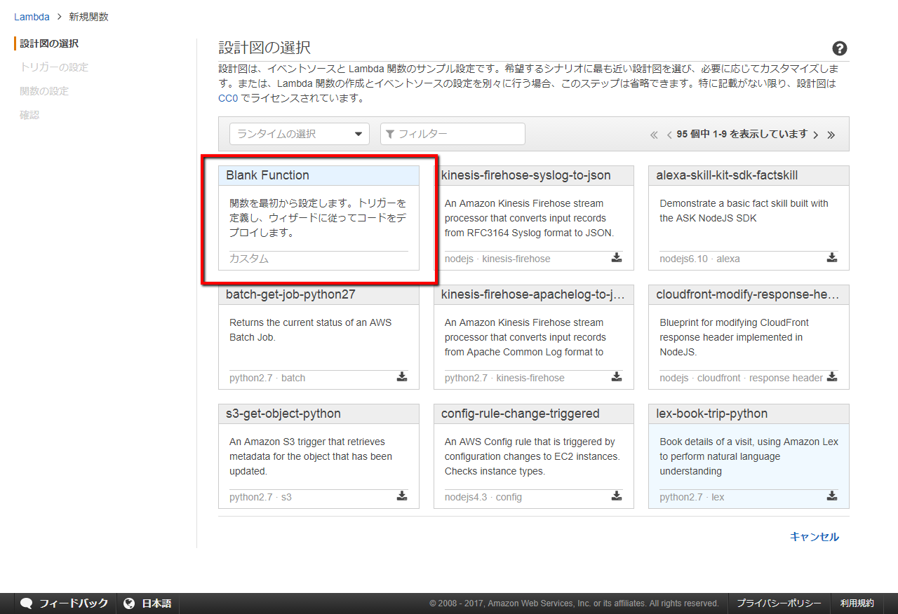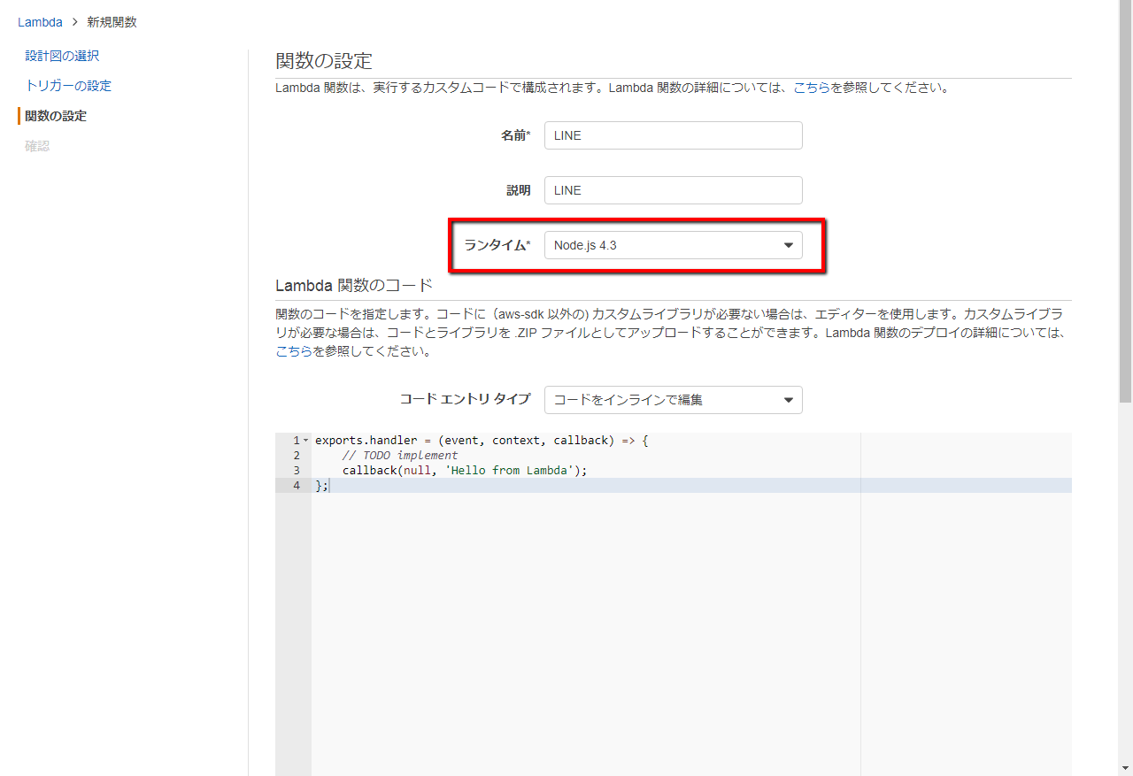 名前と説明は適当に入力し、 今回は Node.js でコードを用意するため「ランタイム」→「Node.js 4.3」を選択します。