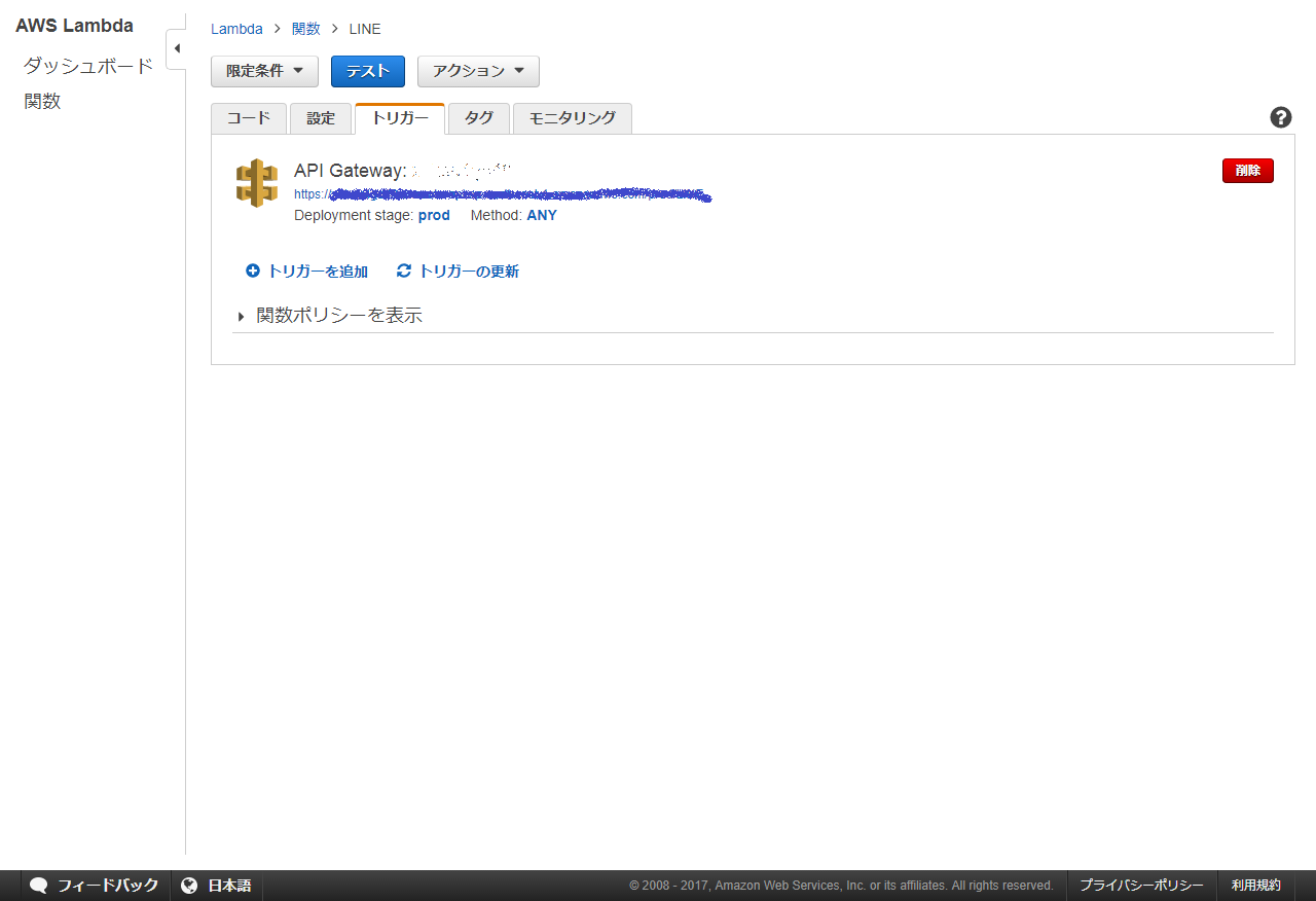 Function の作成が完了すると以下のように API Gateway の URL が表示されます。