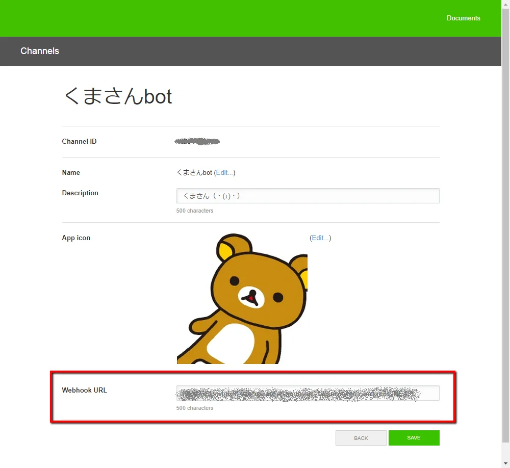 API利用を有効化すると以下のような画面になりますが、ここで「Webhook送信」→「利用する」、「自動応答メッセージ」→「利用しない」に設定します。