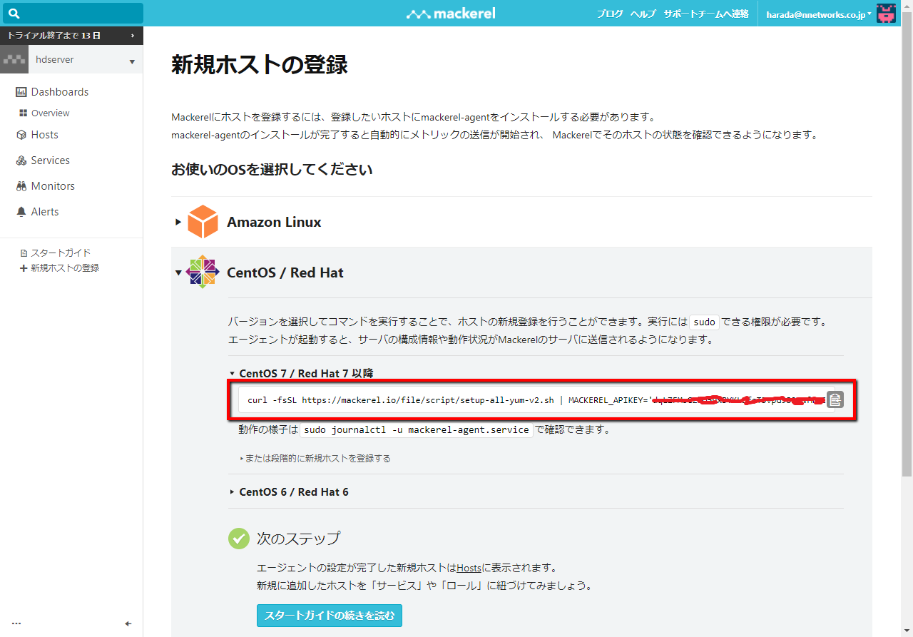 新規ホストの登録手順ページで確認することで、なんとワンライナーでエージェントを追加することができます。 これは楽ちん。