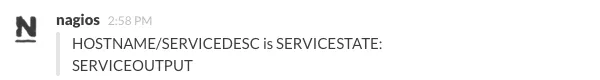 command_line /usr/local/bin/slack_nagios.pl -field slack_channel=#nagios -field HOSTALIAS="$HOSTNAME$" -field SERVICEDESC="$SERVICEDESC$" -field SERVICESTATE="$SERVICESTATE$" -field SERVICEOUTPUT="$SERVICEOUTPUT$" -field NOTIFICATIONTYPE="$NOTIFICATIONTYPE$"