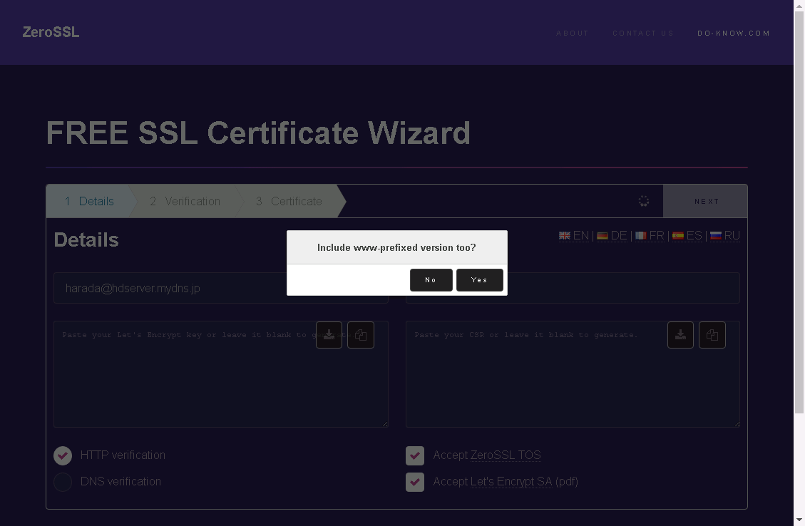 - 「Include www-prefixed version too?(サブドメインにwwwをつけるか)」と聞かれ、今回は必要ないのでNoを選択