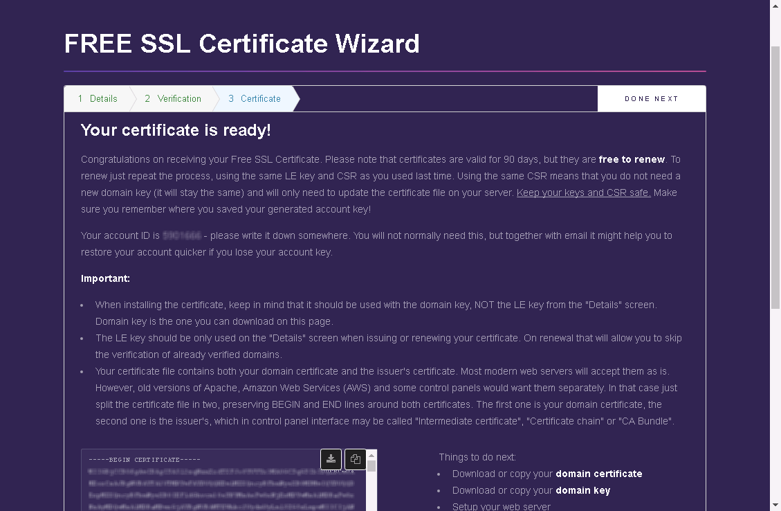 - 左側に Account Key (Let's Encrypt Key – LE Key) が生成されます(更新時に必要らしい)
