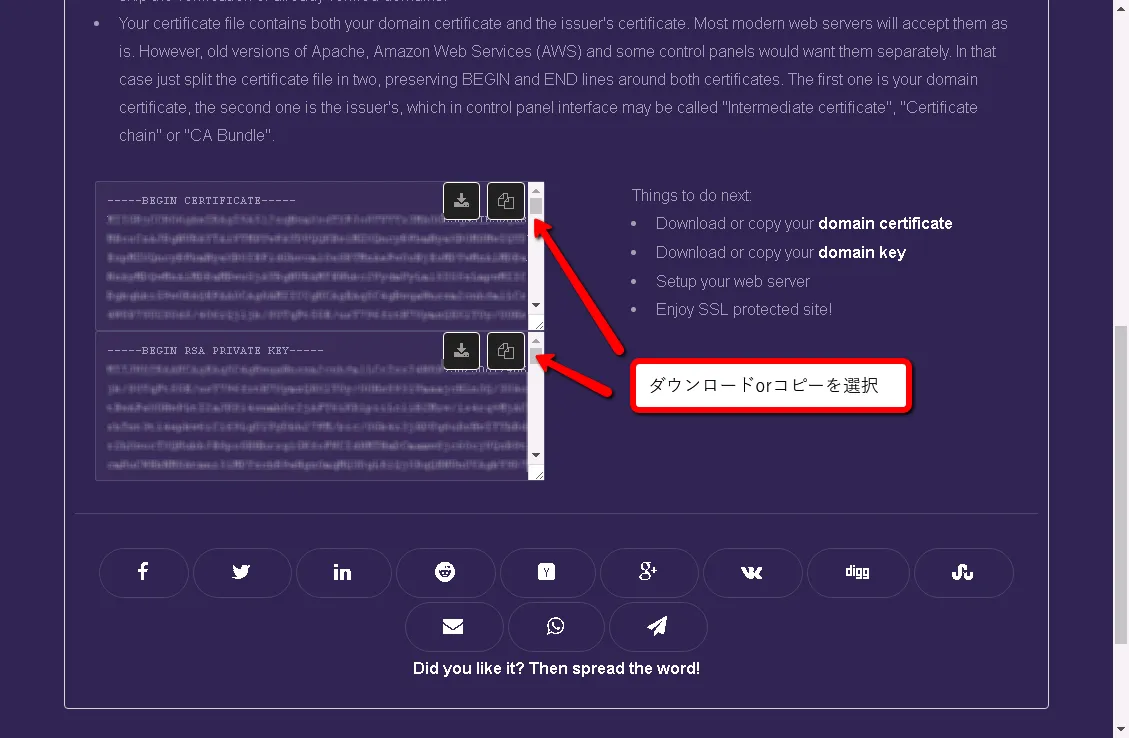 下へとスクロールすると上から「domain certificate」と「domain key」があるので、それぞれコピーして保存しておいてください。