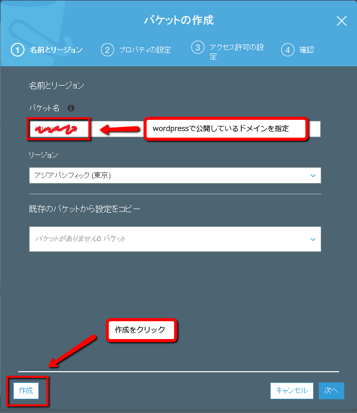 バケット名の箇所に、wordpressで公開しているドメインを指定し、作成をクリックします。