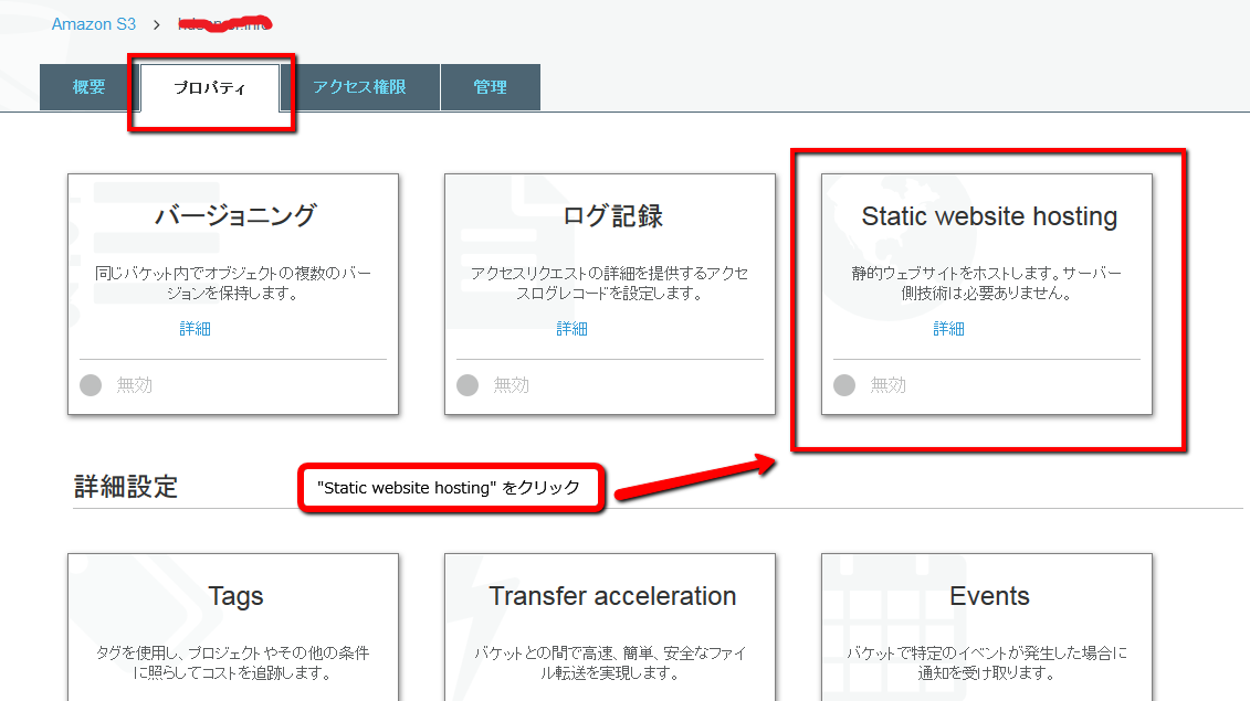 バケットを選択後、「プロパティ」タブをクリックして "Static website hosting"をクリックします。
