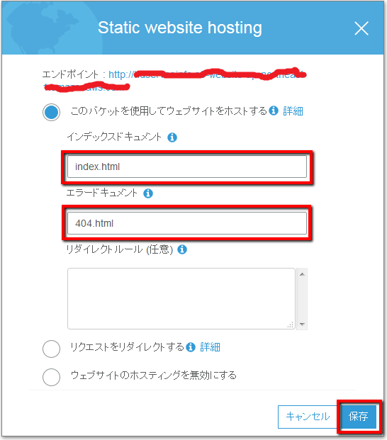 以下の通りにドキュメントを設定して保存します。 なお、「エンドポイント」がS3バケットで公開されるURLになりますので控えておきます。