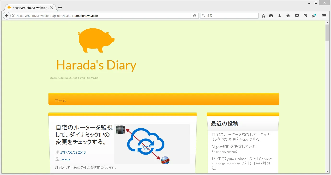 - S3バケットのWeb公開URLにアクセスしてブログサイトが表示されることを確認する