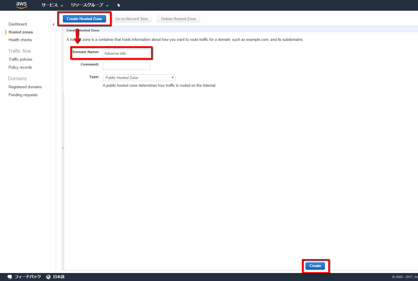 1.Route53にて、「CreateHostedZone」でドメイン名を入力してゾーンを作成。