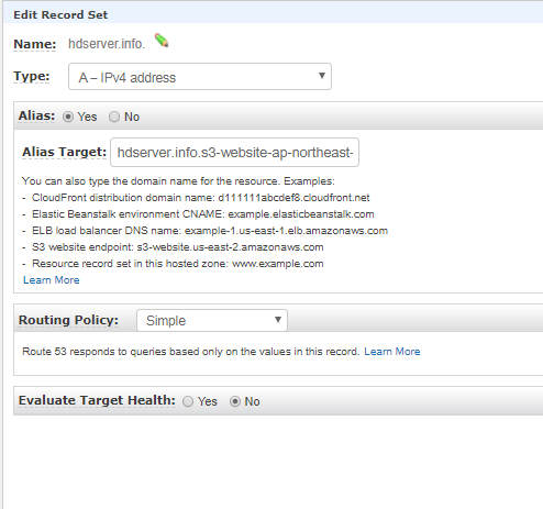 - AliasTargetの欄にフォーカスを当てると、S3のEndpointが出てくるので選択